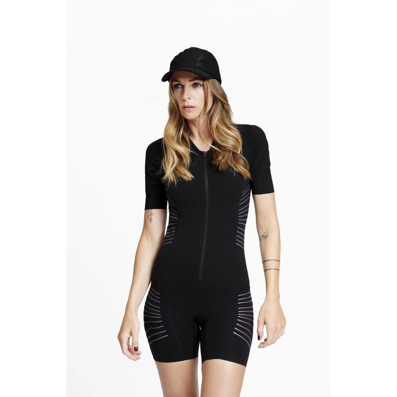 Here is the ultimate fast triathlon one-piece suit for women, designed by Ffion Appleton. The Fe226 AeroForce Sleeved Tri Suit is made from the patented AeroForce material. This material dries four to six times faster than other fibers and is 35 percent lighter. ColdBlack treatment keeps it cool, and the dynamic four-way stretch supports your muscles and movement. The sleeves have a structure that maximizes your speed in the wind. The Fe226 tiger stripes with shades of gray and purple have a body-shaping effect and are reflective. However, they are not only an aesthetic gimmick, but also a performance element. Gel pockets on the sides and a larger one on the back provide space for everything you want to carry.