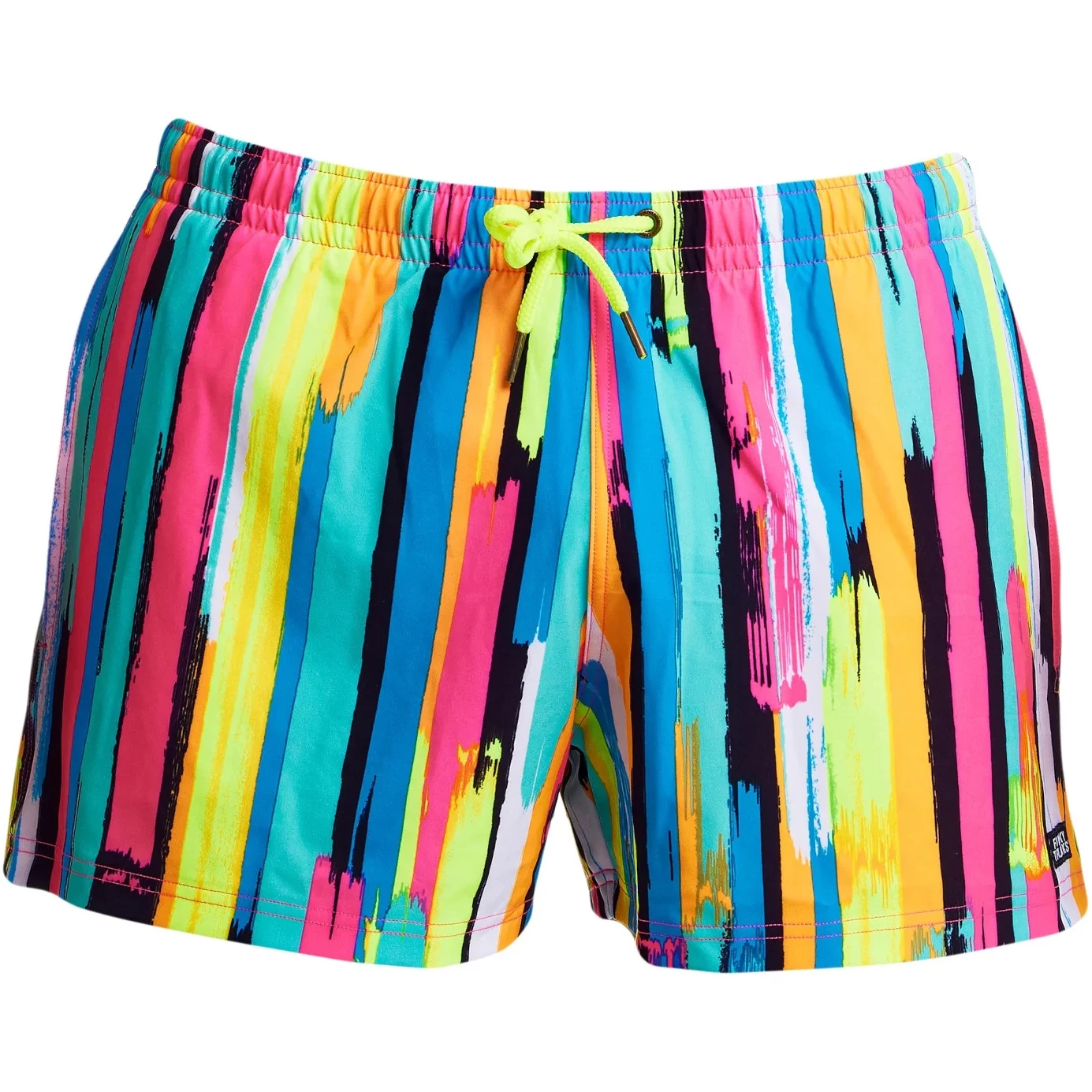 Short and stylish fitted watershorts made of quick drying polyester. They feature a built-in brief for added support, deep side pockets, coin pocket and drawcord to fasten. Now with Funky Trunks branded brass hardware including metal tips, eyelets and rivets. Funky Trunks patch on leg. Inseam length is 8.5cm.