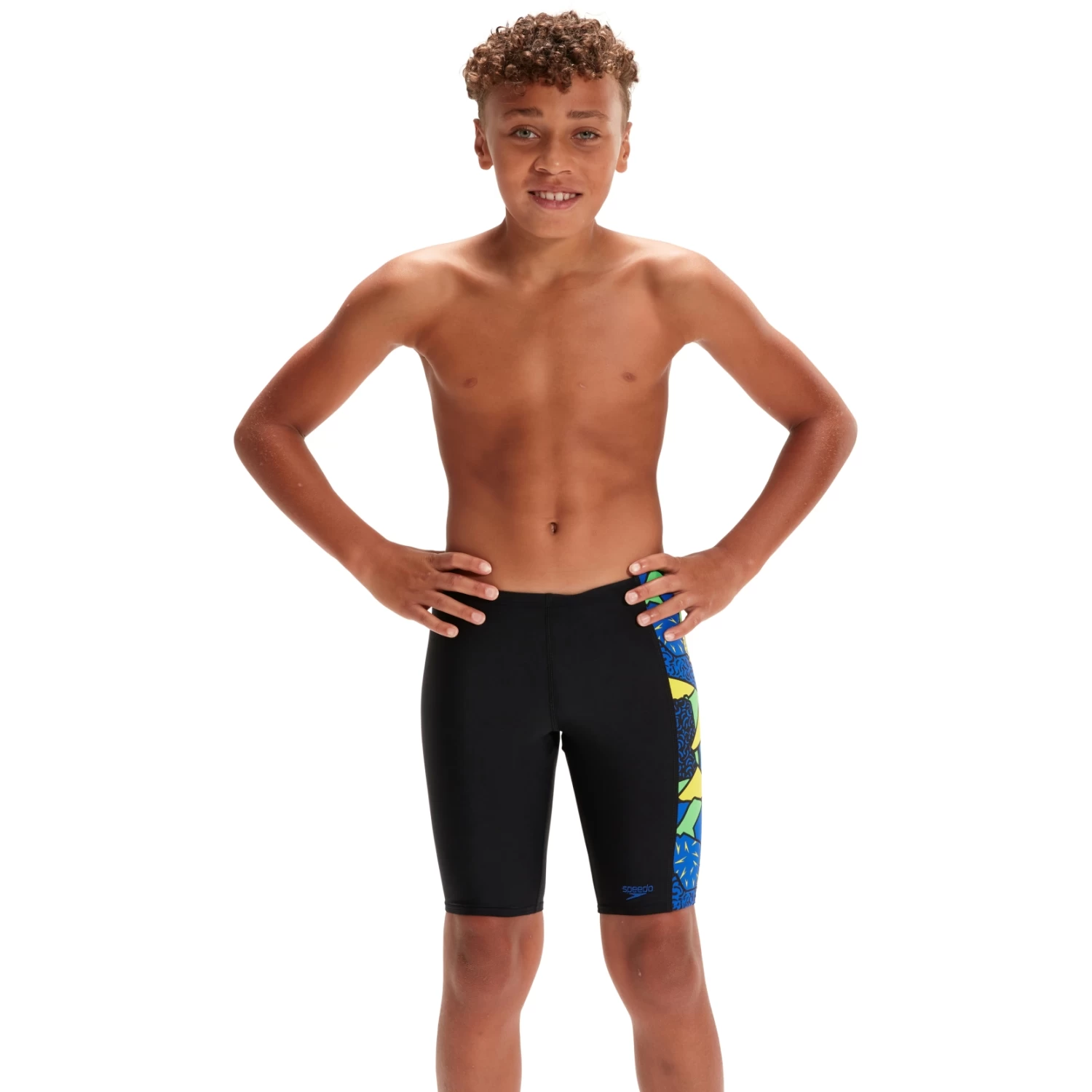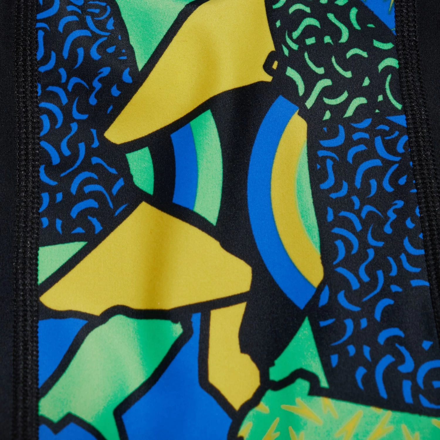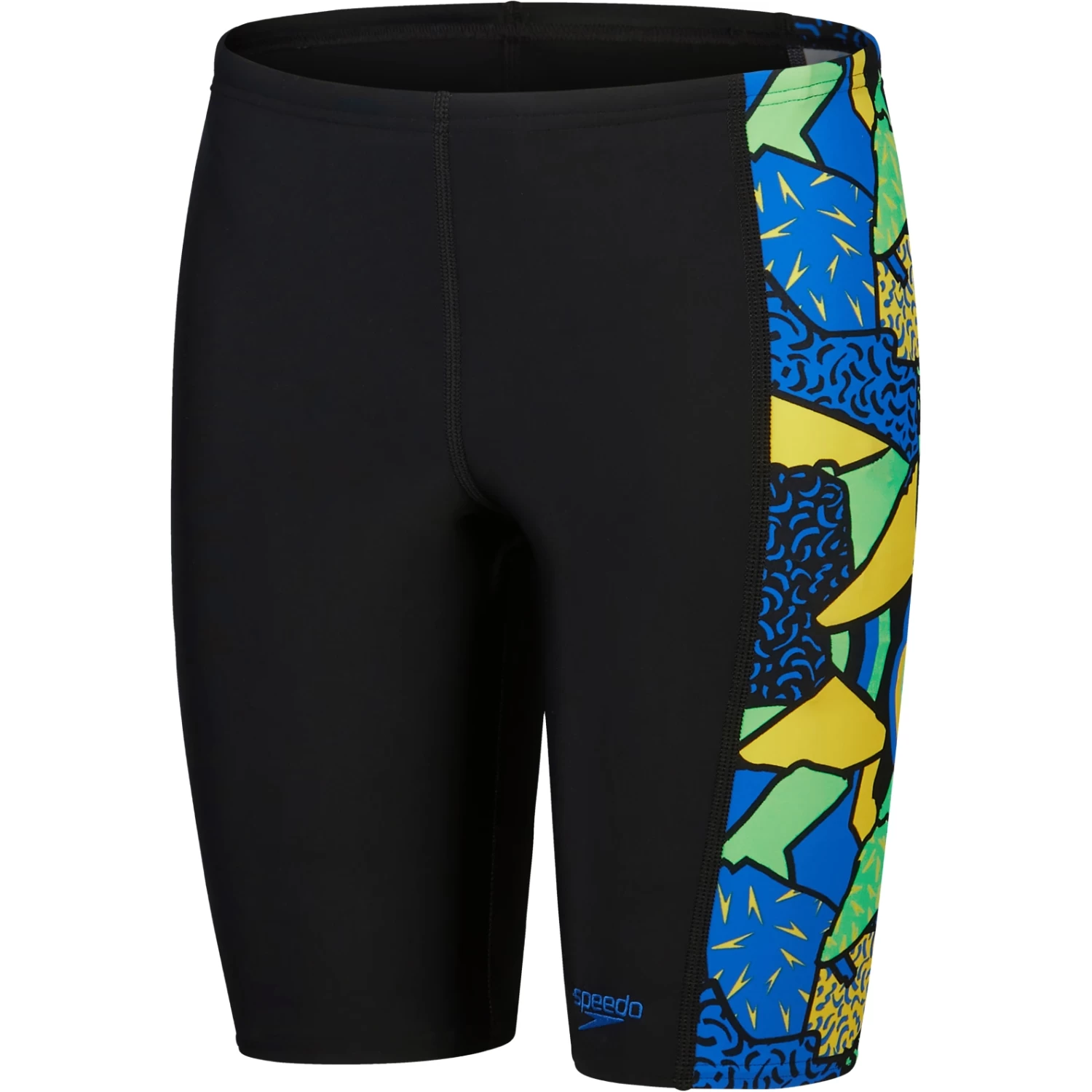 Style and comfort for classes and workouts. Exude confidence with this sleek black jammer that features a side design of our energetic abstract print in bright yellow, green and blue. The jammer is lined on the front for comfort and modesty, and features an internal drawstring so your child can adjust for a secure and comfortable fit.