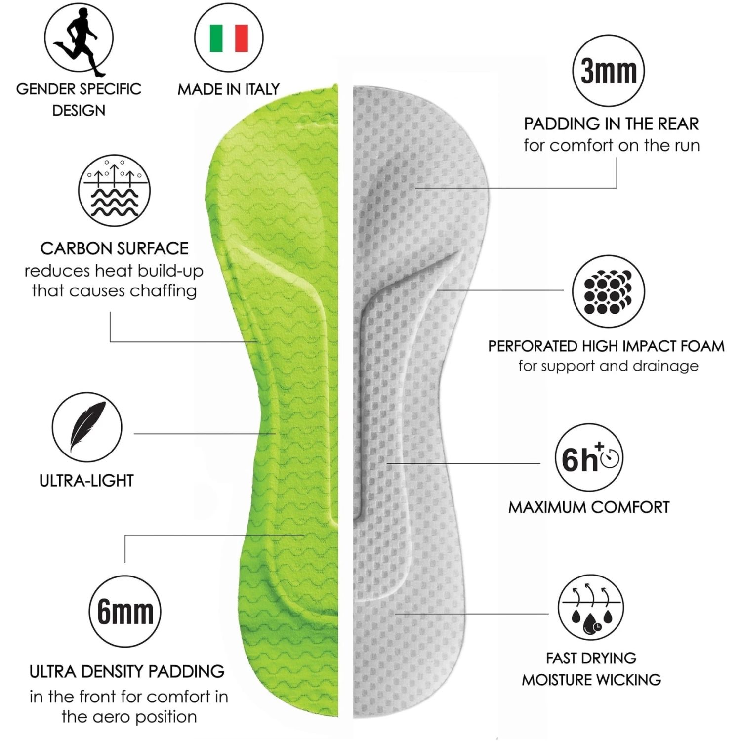 Engineered specifically for triathletes, the is designed to provide triathletes with more protection for the long periods time spent in an aerodynamic position. The unique multi-support construction eliminates pressure peaks that occur towards the nose of the saddle due to the low aero tri bike position. This light-weight slim fitting tri pad is also designed to provide maximum freedom of movement to make the pad disapper when swimming and running.