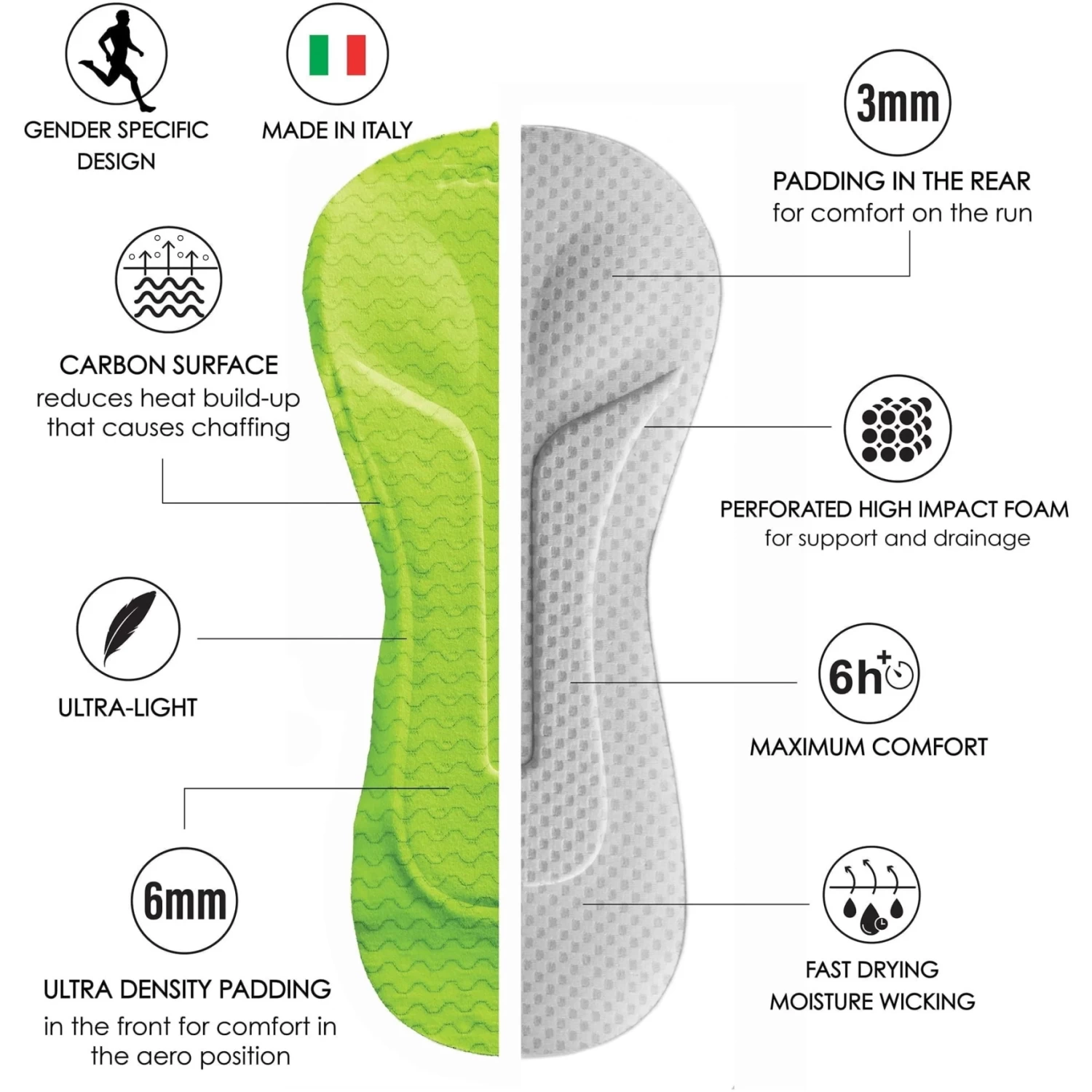 Engineered specifically for triathletes, the PRO CARBON Triathlon Chamois is designed to provide triathletes with more protection for long periods of time spent in an aerodynamic position. The unique multi-support construction eliminates pressure peaks that occur towards the nose of the saddle due to the low aero Triathlon bike position. This lightweight, slim-fitting Triathlon pad is also designed to provide maximum freedom of movement to make the pad disappear when swimming and running.
